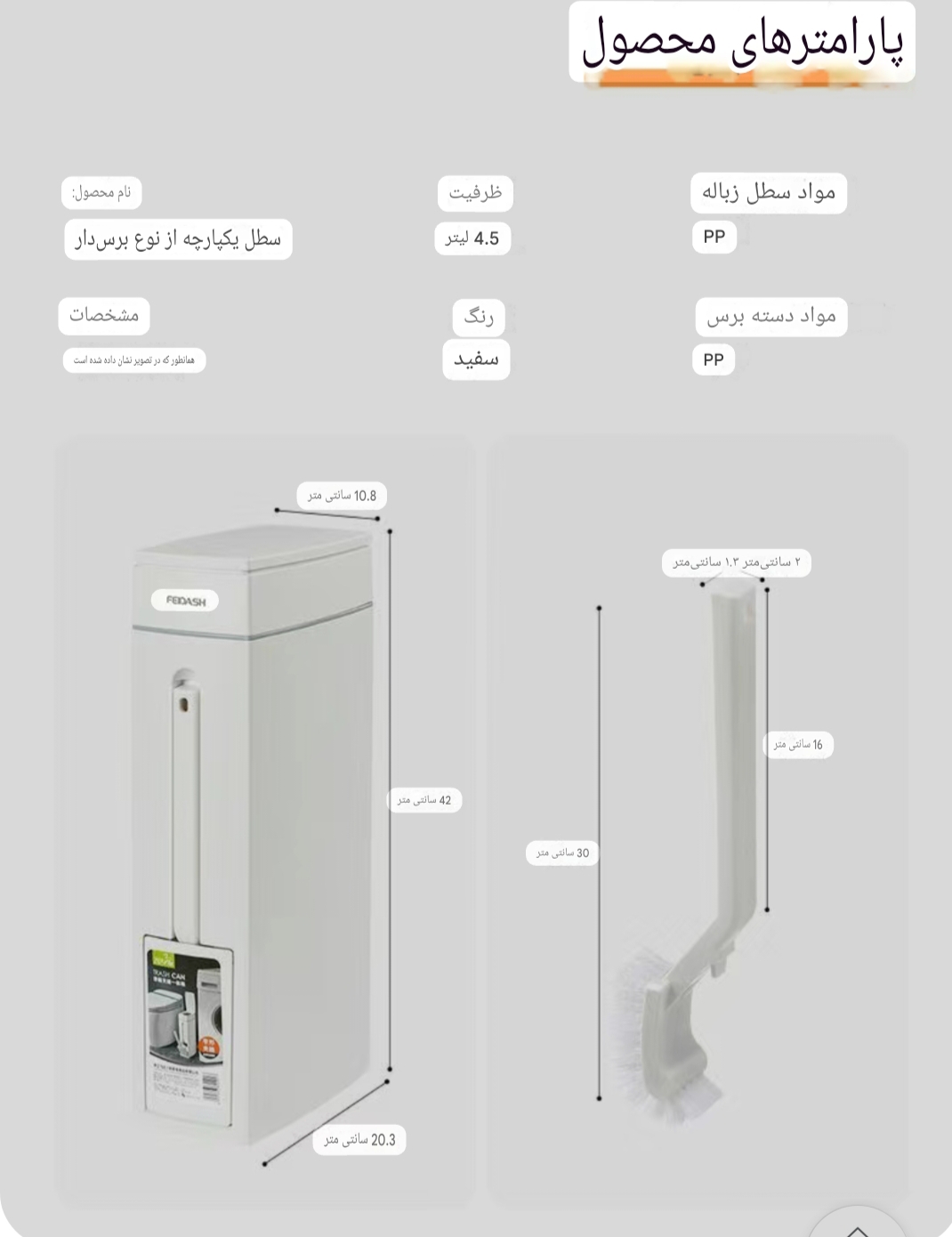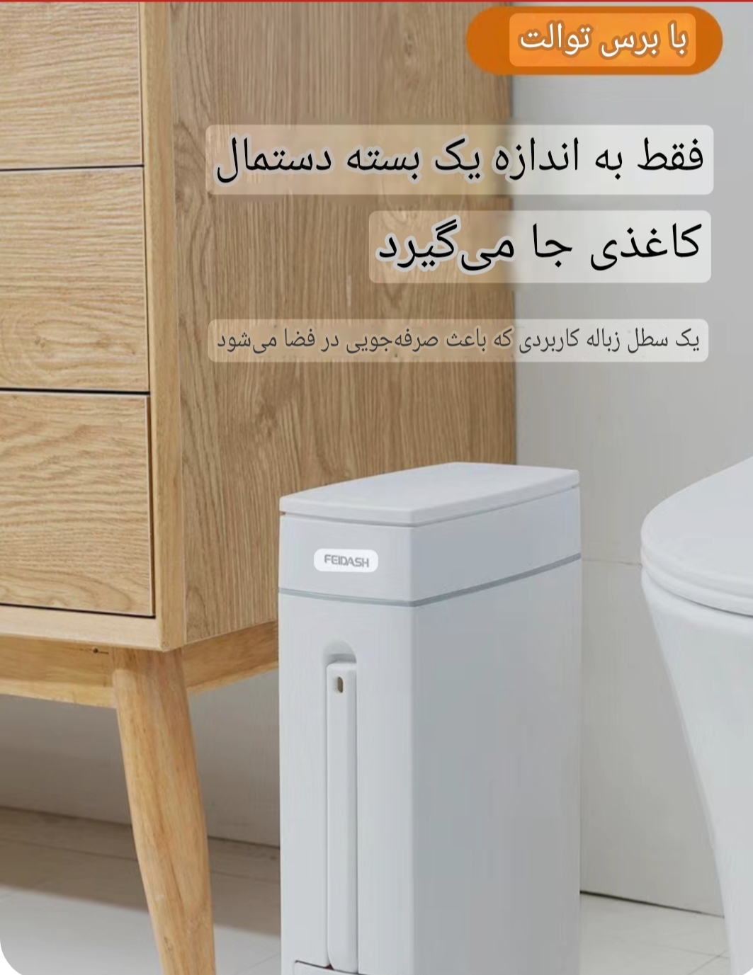 سطل و فرچه توالت فرنگی مگنت دار کم جا سبک مدرن طراحی مینیمالیستی فرچه به هیچ عنوان دیده نمیشود دارای درب فشاری دارای هواکش قسمت فرچه بابت خشک شدن فرچه و گرفتن بوی نامطبوع رطوبت طول 20 عرض 10 ارتفاع 42
